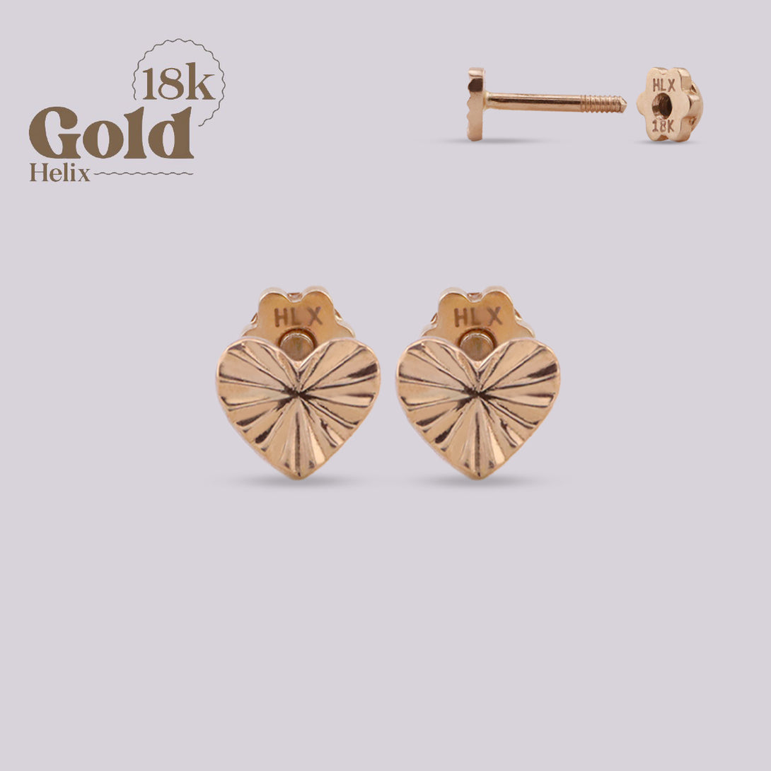 18K Gold Engraved Heart Stud Earrings with Secure Threaded Backs