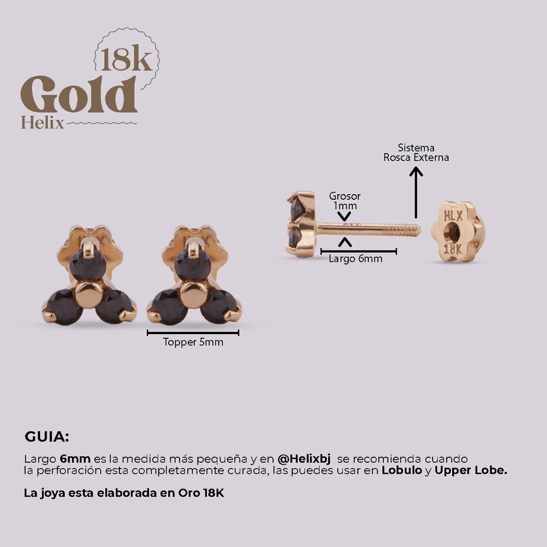 Experience the pinnacle of elegance with these unique stud earrings. Crafted in 18K solid gold, they feature three stunning black diamonds, each hand-set by master Colombian artisans, creating a captivating contrast. Security meets comfort with our innovative external threaded post system, accented with a delicate floral motif. These earrings are not just a symbol of luxury, but a promise of unparalleled security and comfort.
