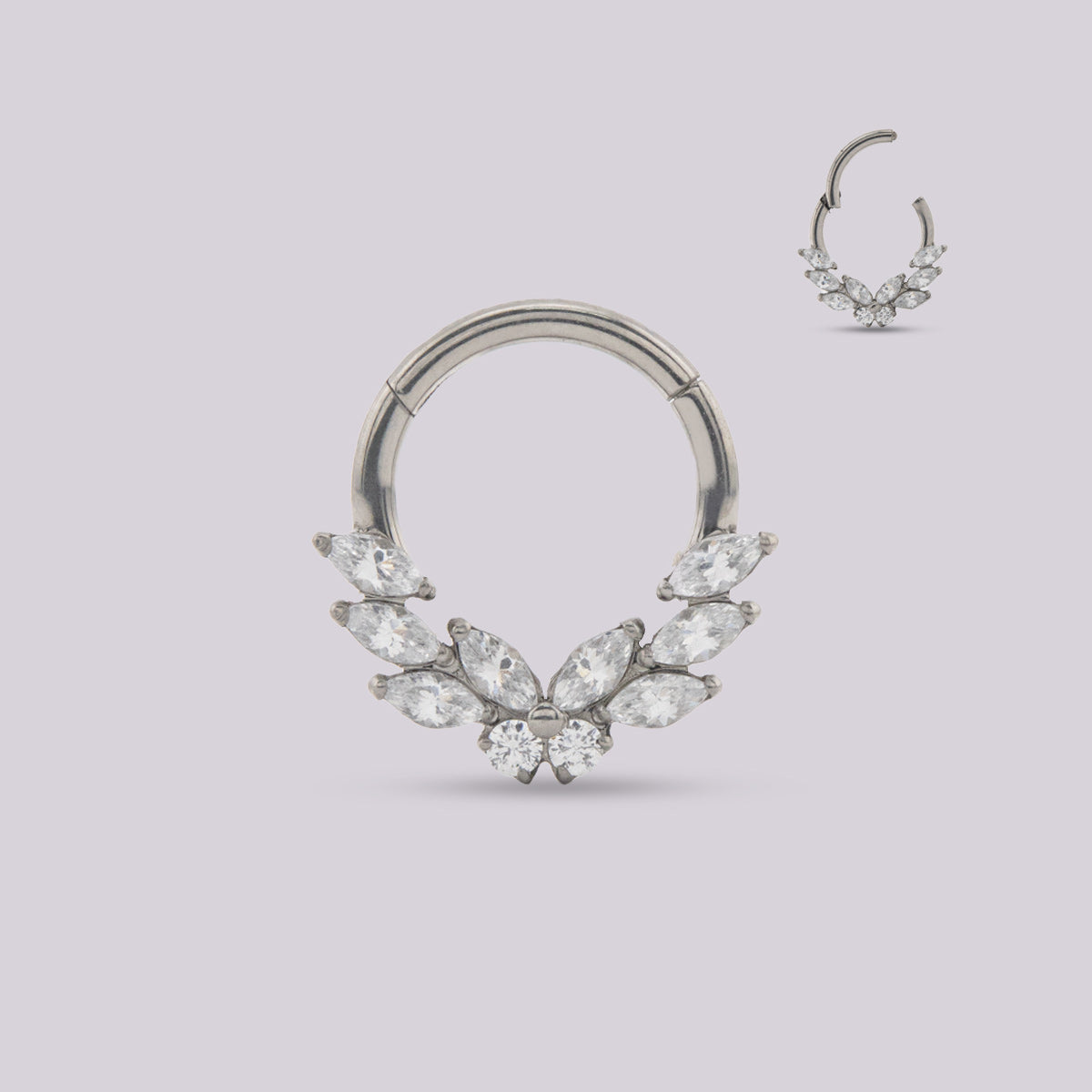 El Aro Clicker Alas de Ángel es una joya llamativa y elegante, elaborada en titanio grado implante, ideal para quienes buscan un look sofisticado con un toque celestial. Su diseño de alas se construye con zirconias tipo pavé que aportan brillo delicado y un acabado premium, perfecto para elevar tu estilo en daith o septum.