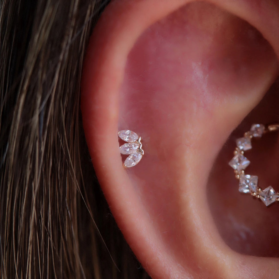 Elegant crown in 14 karat solid gold with push pin system for a secure and comfortable fit. Ideal for Helix, Tragus, Lobe, Upper Lobe piercings. Unique and durable design, perfect for a sophisticated look.