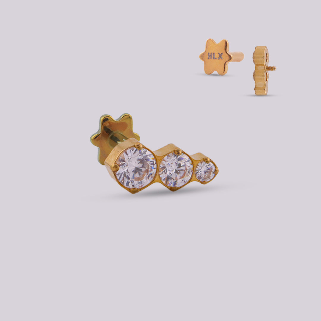 Elevate your style with this high-quality gold titanium piercing, adorned with three sparkling cubic zirconia stones in a graduated design. Its versatile design and medium size make it ideal for various piercings, including Helix, Lobe, and Tragus. Enhance your look with a touch of sophistication!