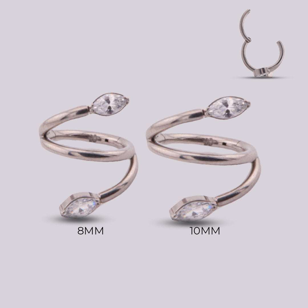 This jewel is characterized by having a double curvature adorned with a petal-shaped zirconia and thus this collection continues the trend of double hoops that is definitely here to stay because with a single jewel you can create an imposing, dazzling and striking EAR LOOK. It is made of Titanium, which makes this piercing a light, hypoallergenic and waterproof piece, ideal for piercings in Helix, Conch, Lobe