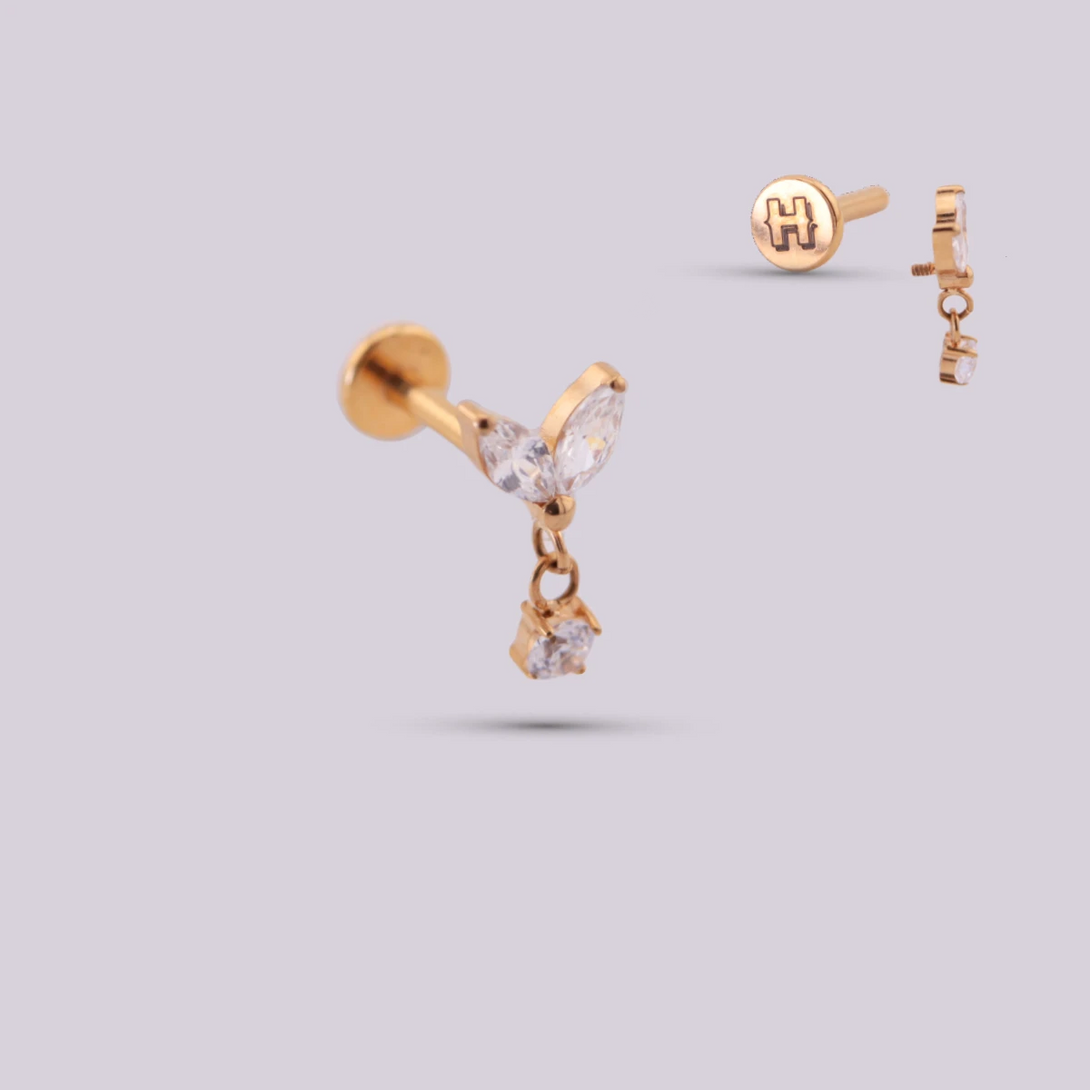 Jewelry with pendants is an increasingly popular option among piercing lovers. These earrings are made up of a labret in the shape of a delicate petal and moon and in the center a small pendant emerges that provides a sophisticated style that will highlight your piercing. exceptionally.