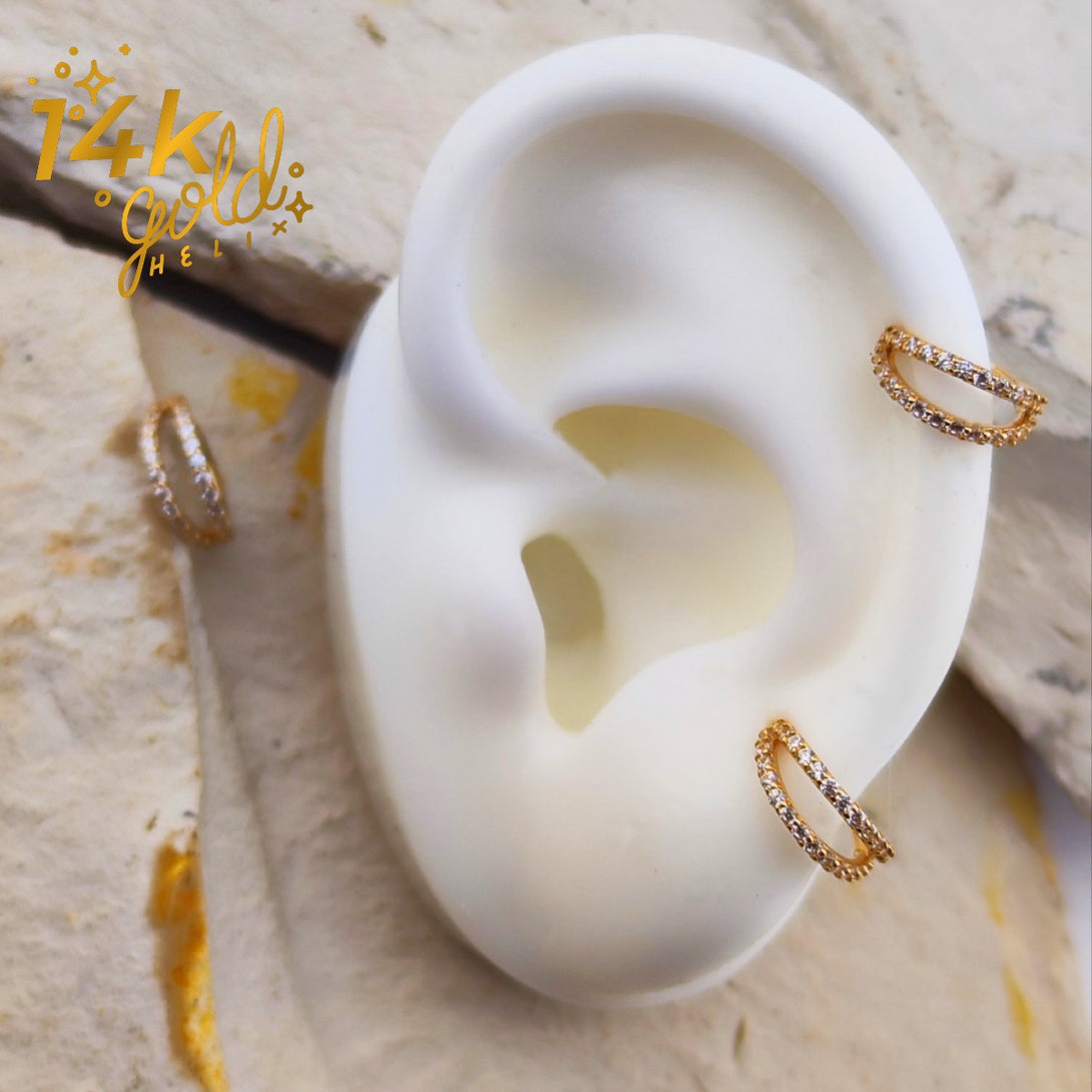 Our best seller “Agata” now comes with all the benefits of 14K solid gold and of course with the beauty of grade 5A zircon. This piercing is a masterpiece because its double bezel shape gives a fine, modern and very chic appearance. Show off this piercing in the Helix, Lobe and Upper lobe and allow the shine of the gold to illuminate your Ear Look.