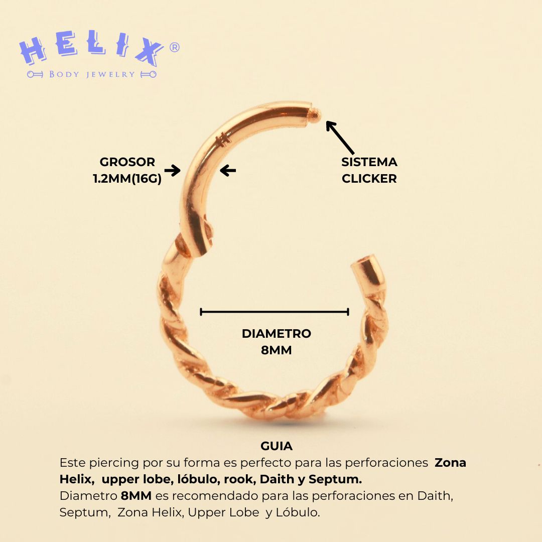 This hoop is characterized by its braid shape, it is a delicate, feminine design with all the qualities of solid 14K gold. It is available in 8mm diameter, for piercings in the Helix, Lobe, Upper Lobe, Daith and Septum Zone.