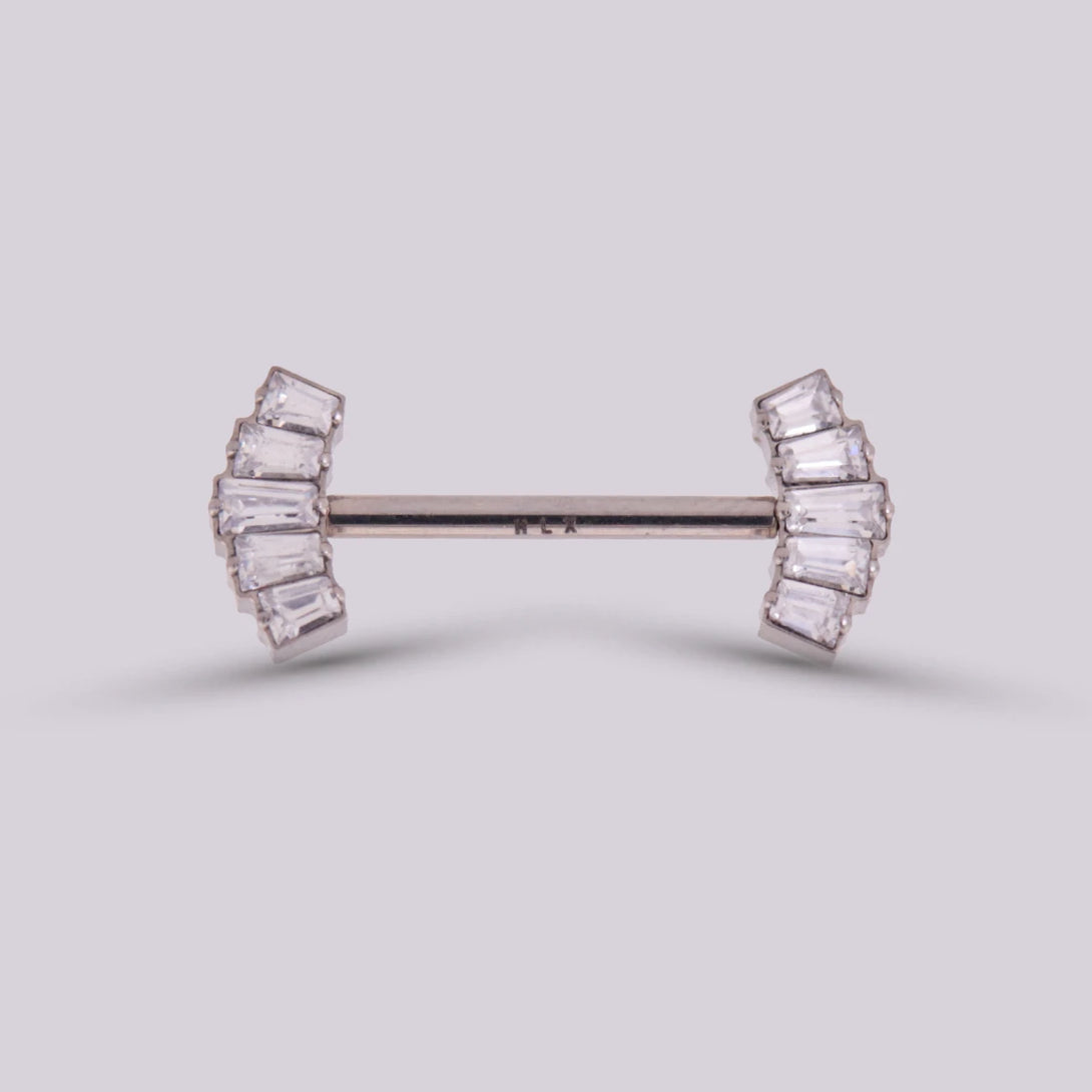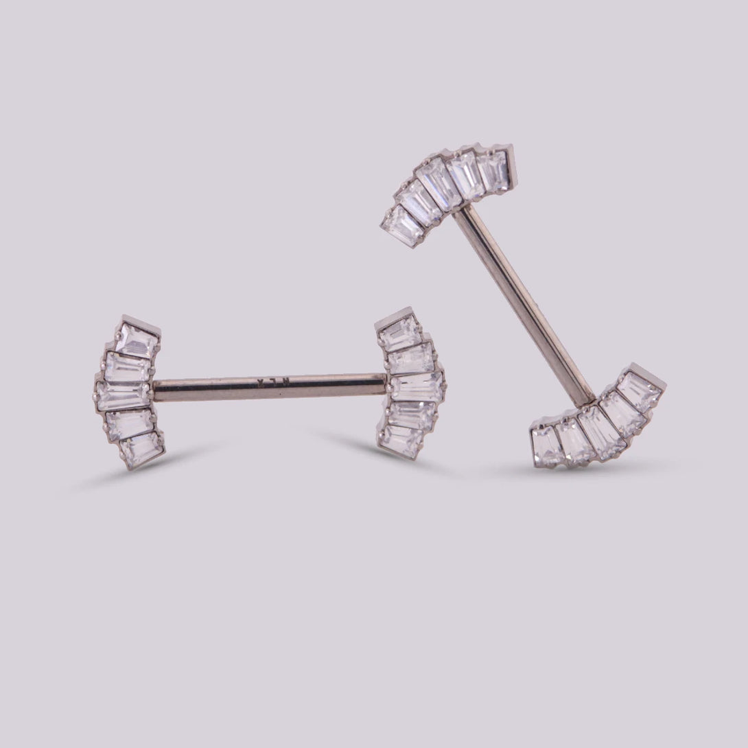 These nipple jewelry are made of Titanium, a high-quality material that is biocompatible with your body, so the healing process will be faster. This piercing has a bar design adorned with crown-shaped side figures and beautiful zircon stones. It is a design that evokes elegance and comfort due to its easy push pin opening and closing system.