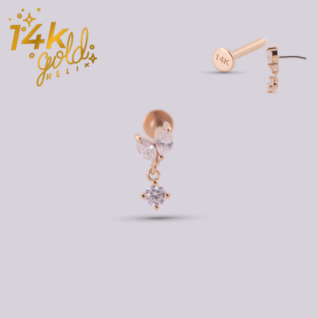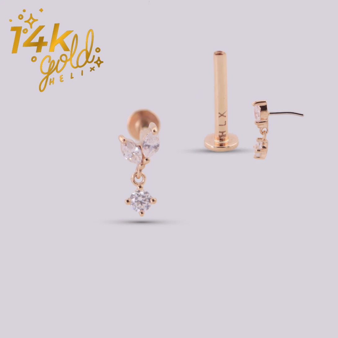 This jewel is made of solid 14K gold with two Swarovski crystals in the shape of delicate and fine petals, it also has a beautiful pendant, suspended with a discreet ring to achieve subtle movement and a perfect shine. The back of the jewel is flat at the back for greater comfort and hygiene, finally the system is push pin, achieving a secure and easy to manipulate clasp.