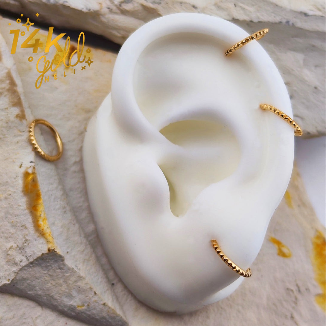 Versatility and Comfort:  This beautiful jewelry adapts to piercings in the Helix, Rook, Lobe, Upper Lobe area. Made with 14 karat gold, these jewelry not only stand out for their unique design, but for their long-lasting quality. Since time immemorial, gold has been praised for its timeless beauty and unparalleled durability in the world of jewelry. Solid 14K gold piercings are an expression of luxury and distinction that redefines the art of body modification.