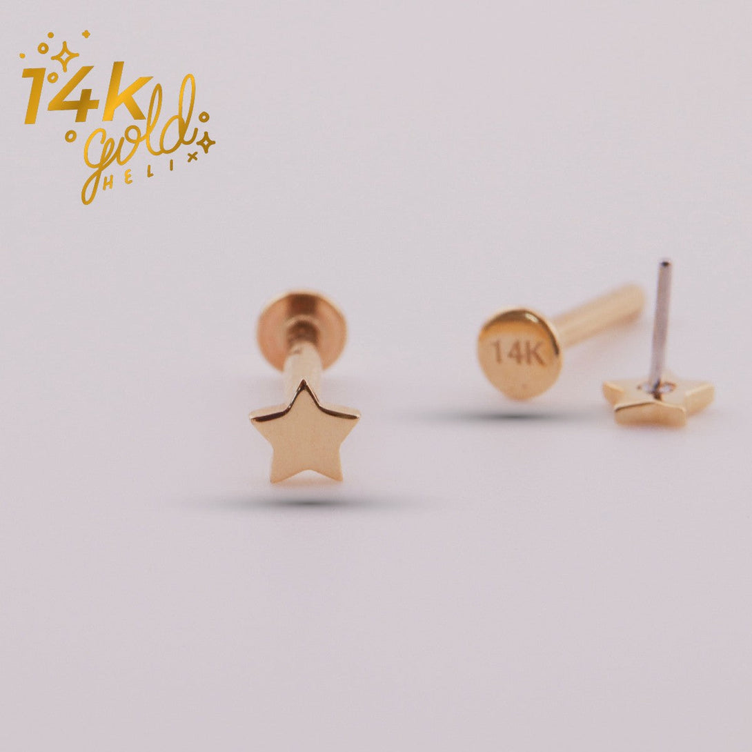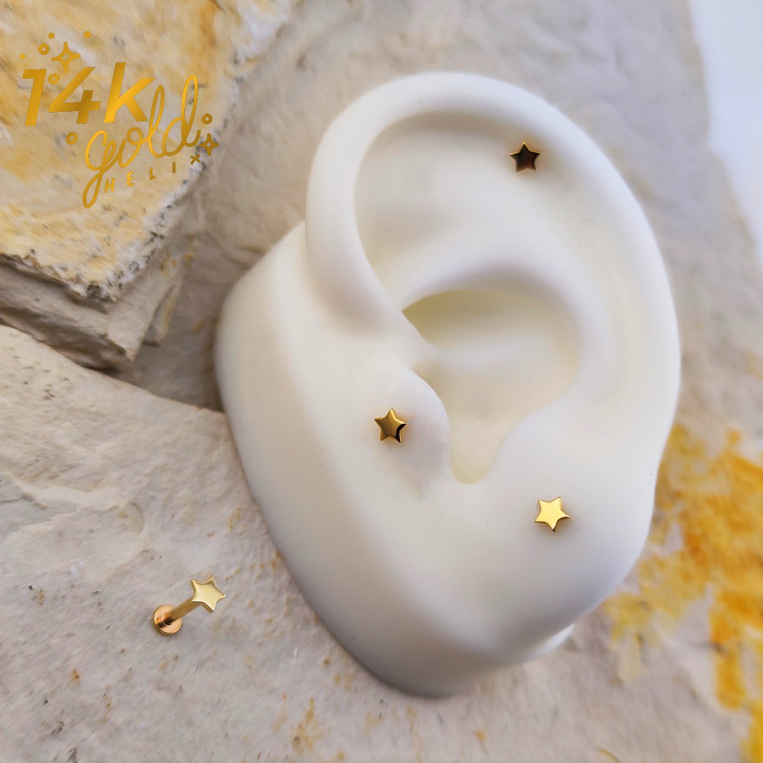 We love star-shaped piercings and even more so when they are in gold! The star designs are timeless, they combine with other types of jewelry and look divine whether in the Helix, Tragus, Conch, Lobe or Upper lobe area.