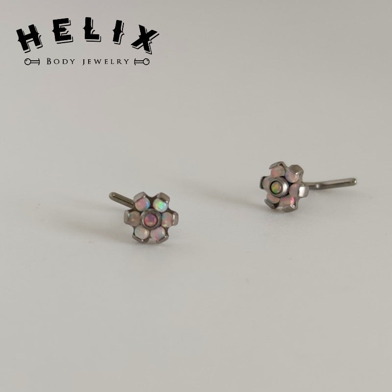 Nostril Flor Opalo, es una joya moderna, muy juvenil y bonita que te permitirá darle un toque creativo y con mucho estilo a tu perforación de nariz. Esta joya esta elaborada en titanio con incrustación de piedra opalo.