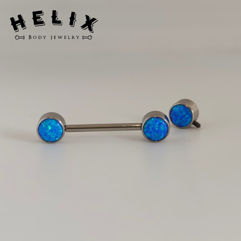 This Jewel is made up of a bar adorned by two opal at the ends, it is a classic piercing that is essential in your Nipple jewelery collection, it is light, elegant and adorns your piercing with style, it is made of titanium with an internal thread system