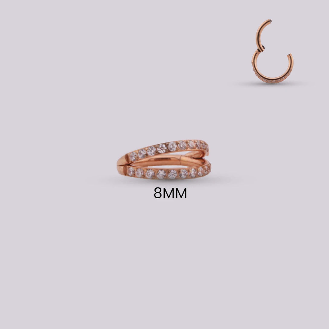 Elevate your style with our beautiful rose gold Agata piercing, adorned with two sparkling rhinestone bezels. This sophisticated and modern design is perfect for performing your Lobe, Helix, Conch and Upper Lobe piercings. The rose gold hue reflects elegance and is a quite different option from classic colors like gold and silver, while the cubic zirconia stones add a touch of subtle shine.
